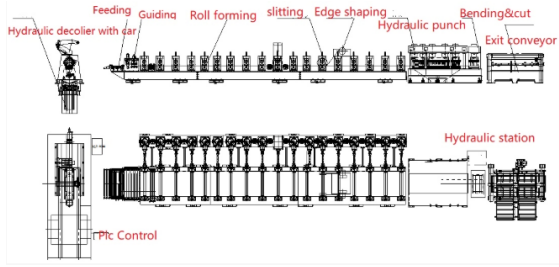 Hydraulic Decoiler→Feeding and Guiding→Roll forming (Edge shaping, slitting and winding)→Hydraulic Punching→Bending→Cutting→Exit conveyor