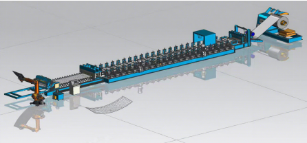 This production line consists of hydraulic decoiler with car, leveling feeder, flat shearing machine, slitting mechanism, edge-receiving machine, roll forming machine, hydraulic punching machine, crimping machine, hydraulic bending and shearing machine, Exit conveyor, as well as hydraulic system, electronic control system and other components.